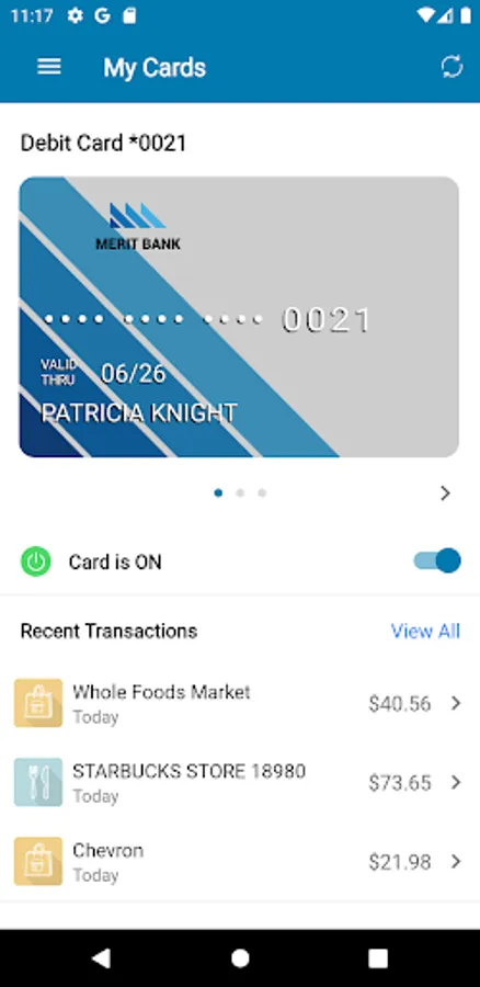 Merit Bank Card protects your debit cards by sending transaction alerts and giving you the ability to define when, where and how your cards are used. Simply download the app to your smartphone, then customize your alert preferences and usage settings to monitor and manage your cards.