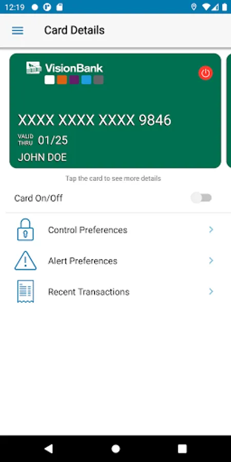 When the card is “on” transactions are allowed in accordance with your usage settings. When the card is “off” no purchase or withdrawals are approved until the card is subsequently turned back to “on”. This control can be used to disable a lost or stolen card, prevent fraudulent activity in the card.