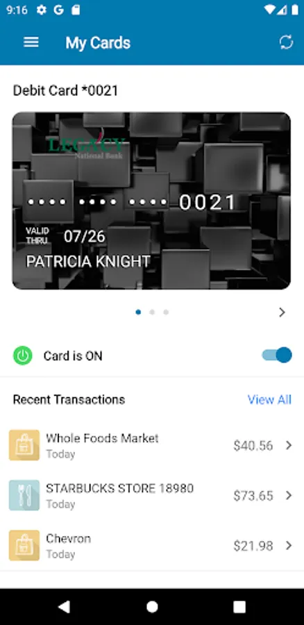 Legacy National Bank protects your debit cards by sending transaction alerts and enabling you to define when, where and how your cards are used. Download Legacy Card Valet to your smartphone, then set your preferences to monitor and manage your cards.