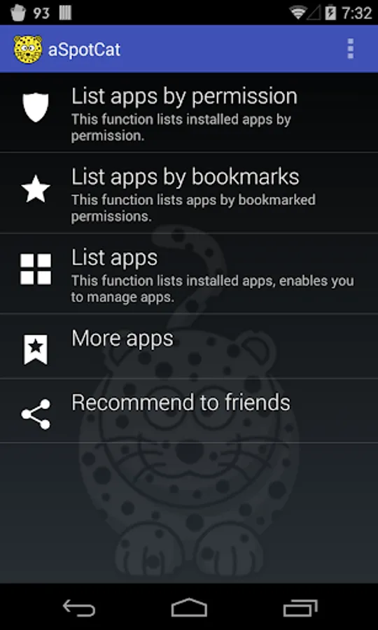 aSpotCat lists installed apps by permission to help you find and uninstall the malicious apps.