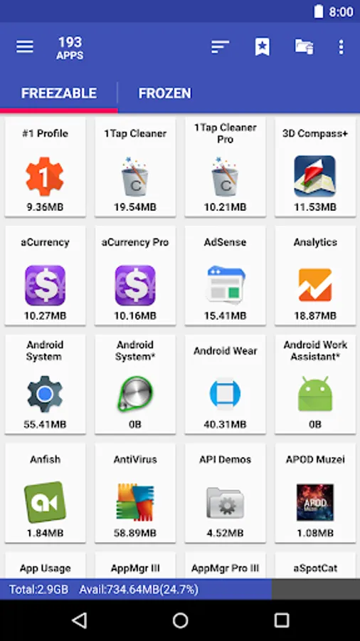You can freeze apps so they won't use any CPU or memory resources and consume zero-battery. It's good for you to freeze apps that you would like to keep in device, but don't want them to run or be uninstalled.