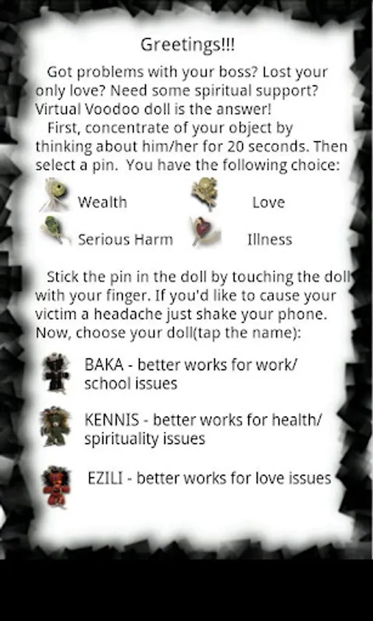Got problems with your boss? Lost your only love? Need some spiritual support? Virtual Voodoo doll is the answer! Features include: your choice of 3 dolls - each works better with a particular type of issue, choice of 4 pins - Wealth, Love, Serious Harm, Illness. This app has a lot of magic power. Torture responsibly.