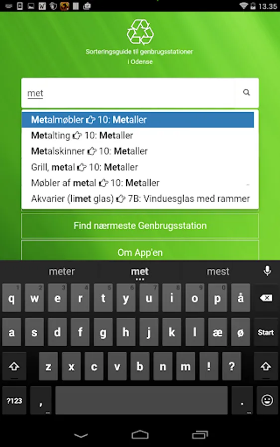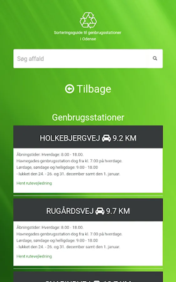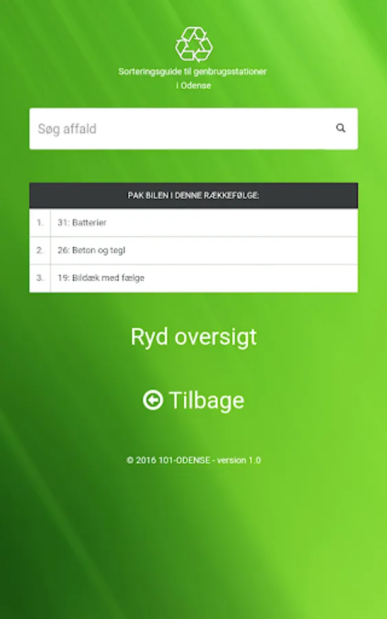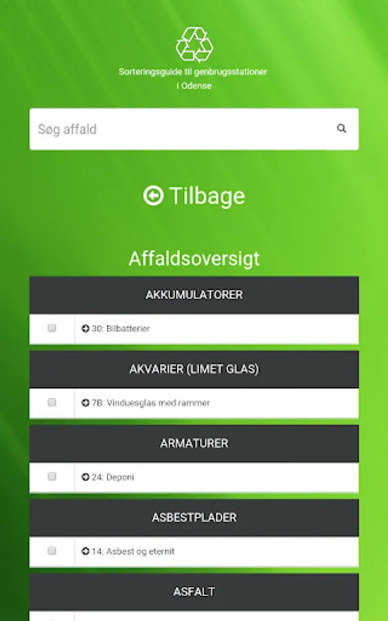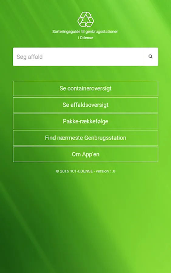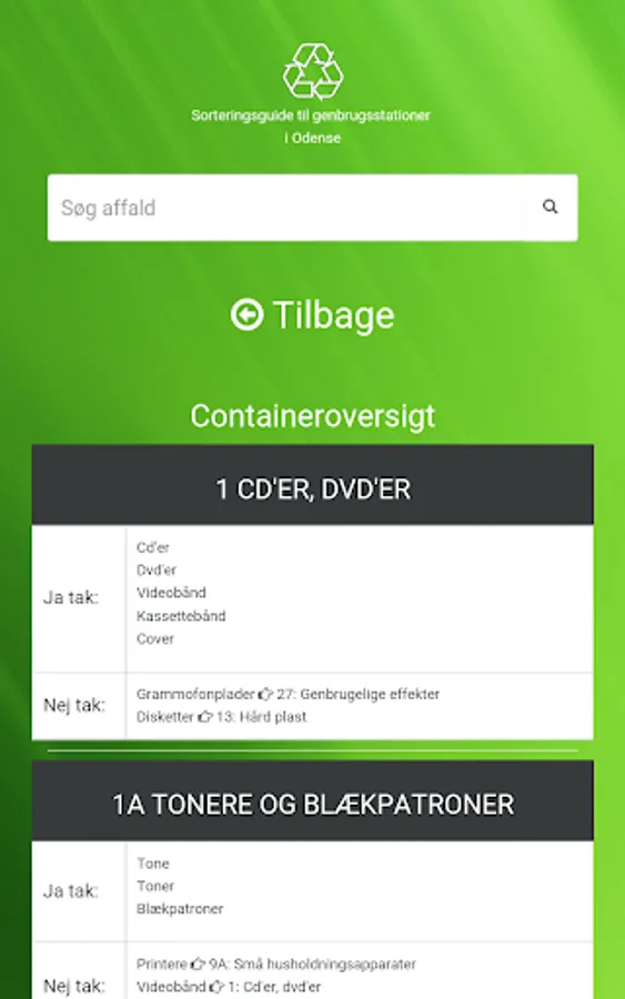 In this app you can search the waste, and get to know which container waste must be in. Currently the app recycling in Copenhagen, Aarhus and Odense.