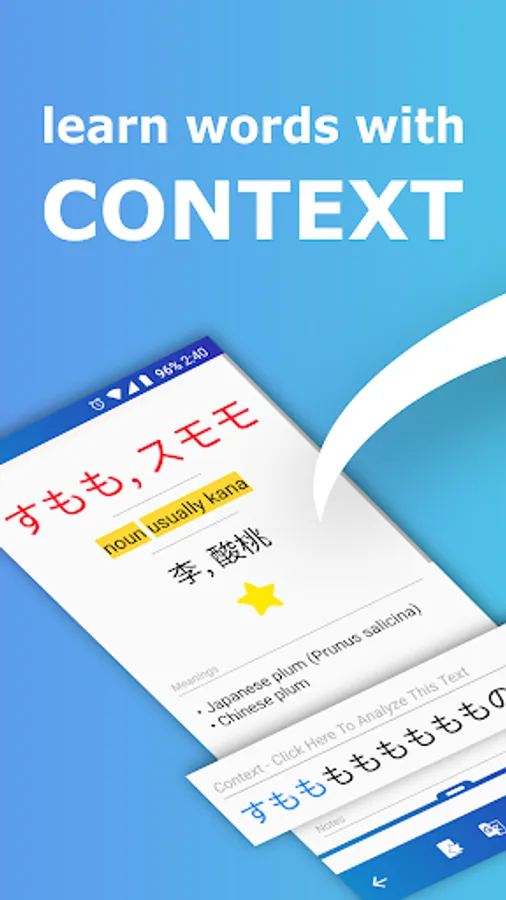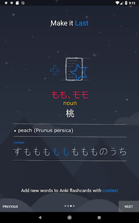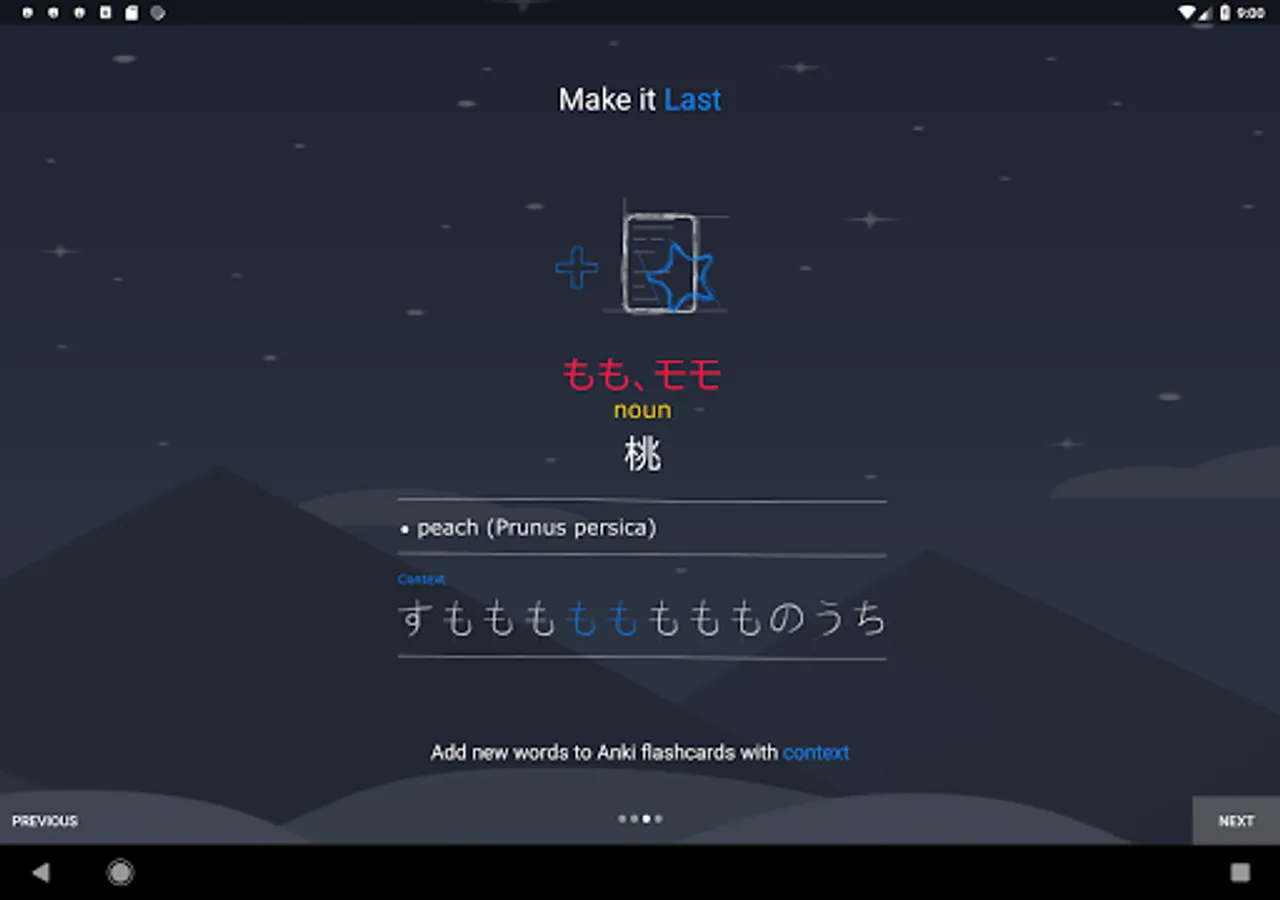 • Make it Last: by putting the words into Anki flashcard, you make sure it will remains on your long term memory. Anki is the most powerful flashcard app, an essential tool for millions of language learners. Moreover, your words will be accompanied by context of the text you have been reading.