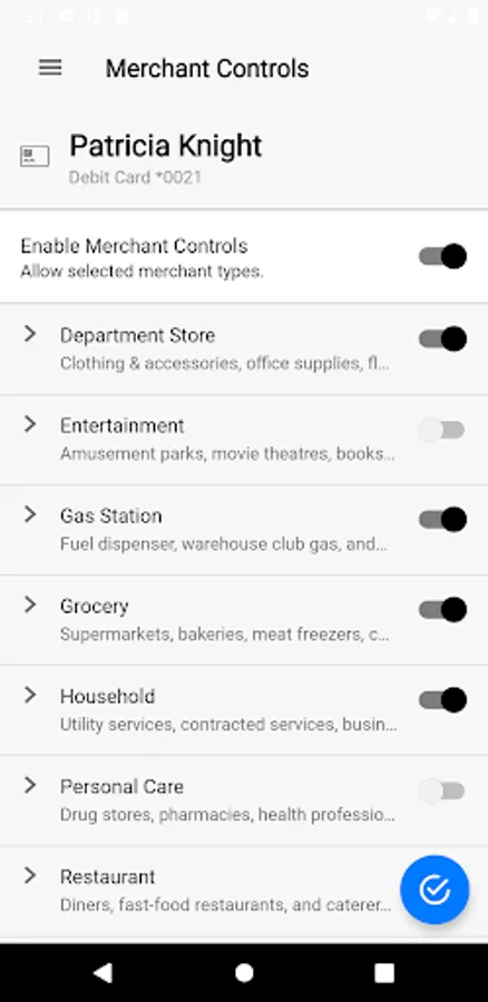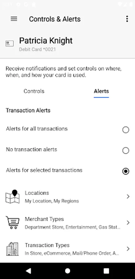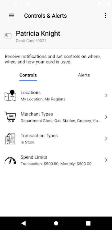 Usage Controls and Alerts Set spending limits to decline transactions above your thresholds. Monitor activity by category such as gas stations and restaurants, and by type: in-store purchases, e-commerce transactions and ATM transactions.