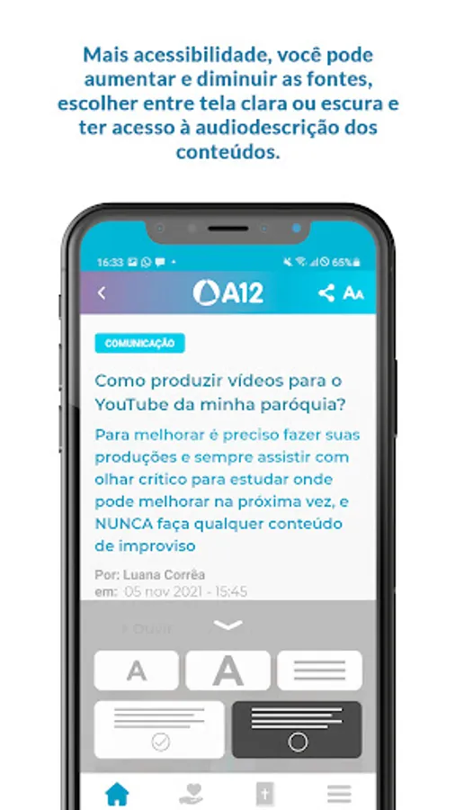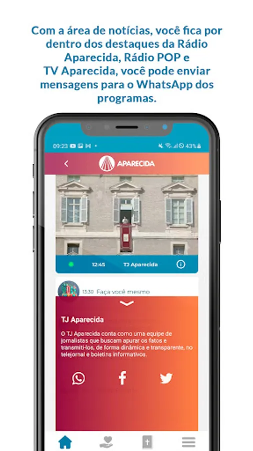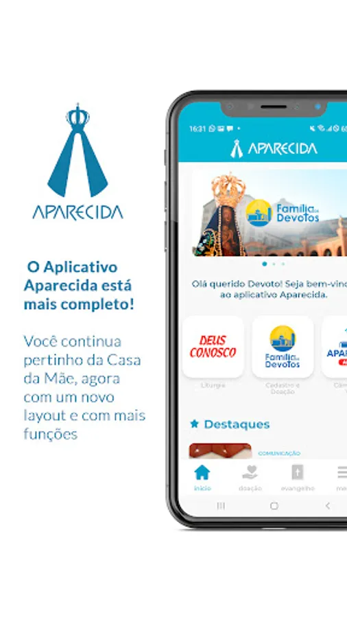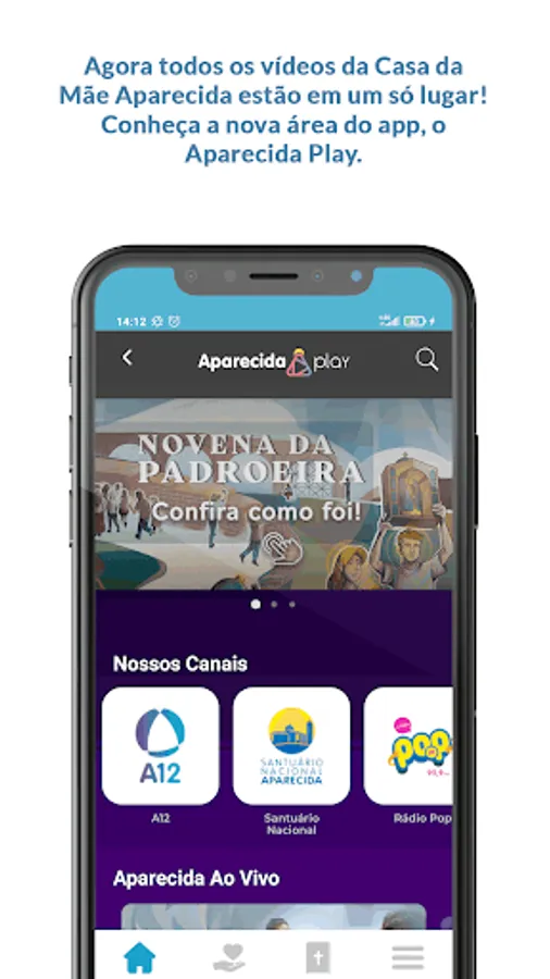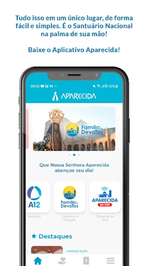 The Aparecida application brings together the National Sanctuary, Aparecida Radio and TV, Editora Santuário and Portal A12 with a single objective: to bring the Good News of the Gospel to all devotees of Our Lady of Aparecida. Try it!