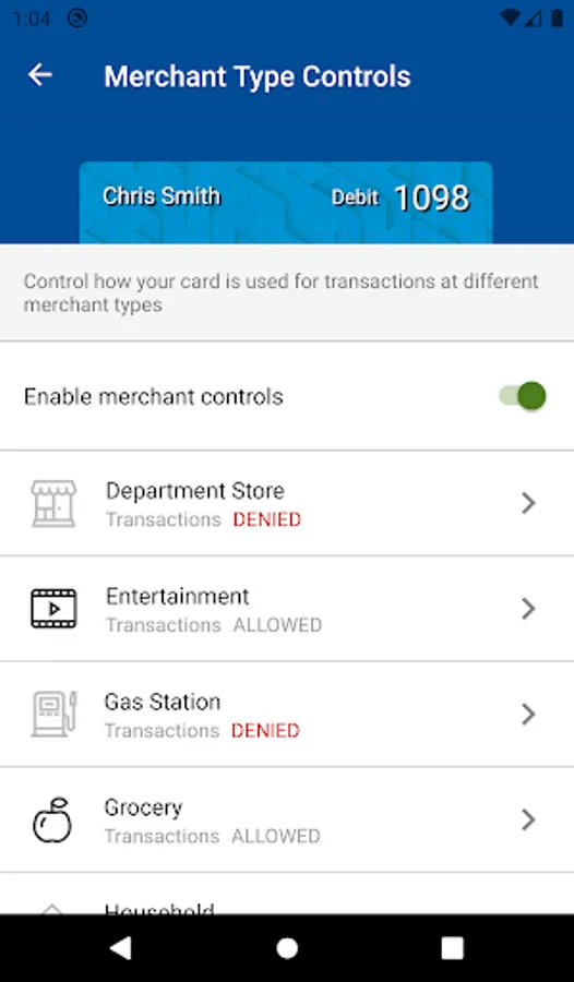 Set spending limits to decline transactions above your thresholds. Monitor activity by category such as gas stations and restaurants, and by type: in-store purchases, e-commerce transactions and ATM transactions.