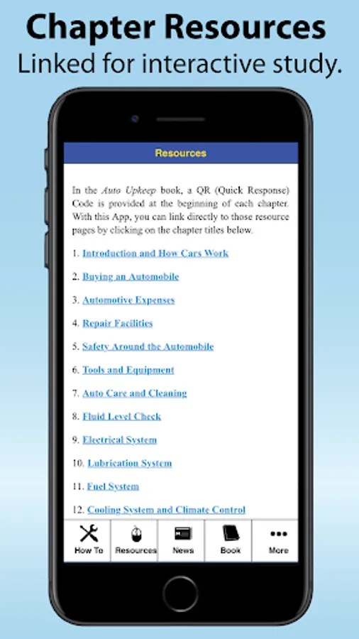 RESOURCES. Provides links to additional online resources that correlate to the chapters within the Auto Upkeep textbook.