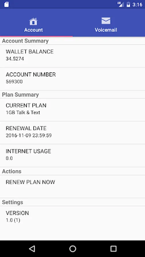 1klick Mobile Companion allows you to view your account information including current plan information an expiry. It also provides a visual voicemail interface to easily listen to your voicemail messages.