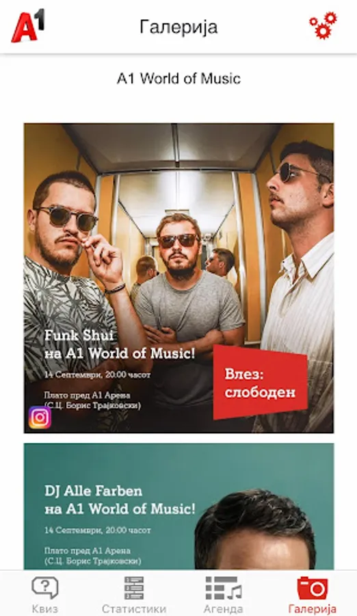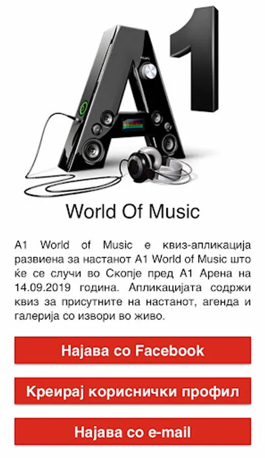 A1 World of Music is a quiz app developed for the A1 World of Music event that will happened in Skopje on 14.09.2019. The app contains the agenda of the event, live feed gallery and a quiz for the attendants of the festival.