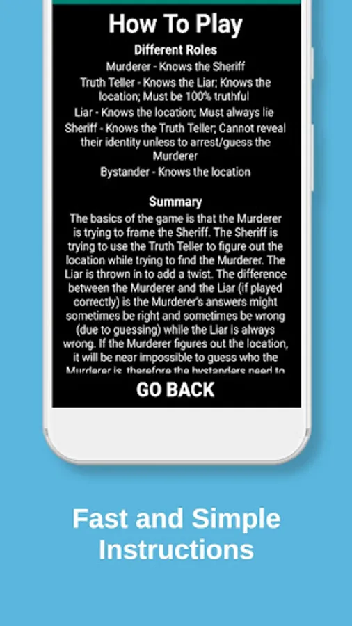 Sheriff - Knows the Truth Teller; Can not reveal their identity unless to arrest/guess the Murderer
