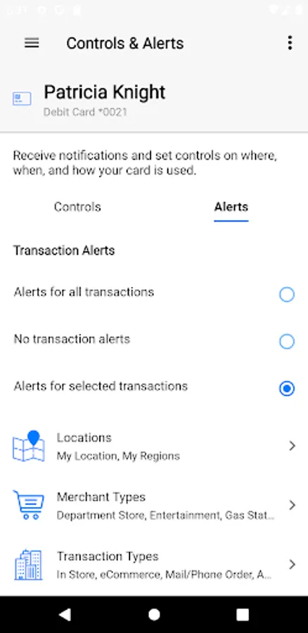 • Set location-based transaction restrictions based on your location (using your phone’s GPS) or by region (selecting a city, state, country or zip code on an interactive map).