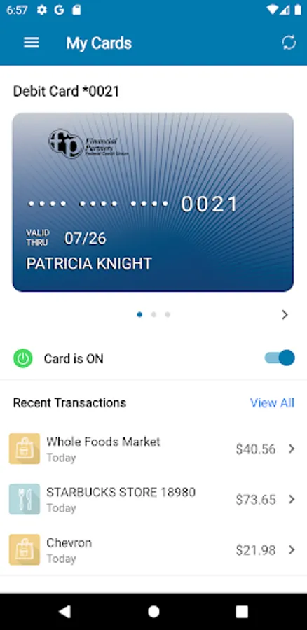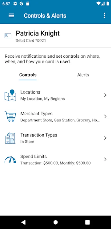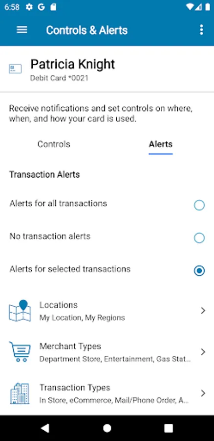 Alerts for PIN and Signature transactions can be set up to keep you informed of your debit and credit card usage and help you quickly detect unauthorized or fraudulent activity. The app can send an alert when a card is used or when a transaction has been attempted but is declined – additional customizable alert options are available.