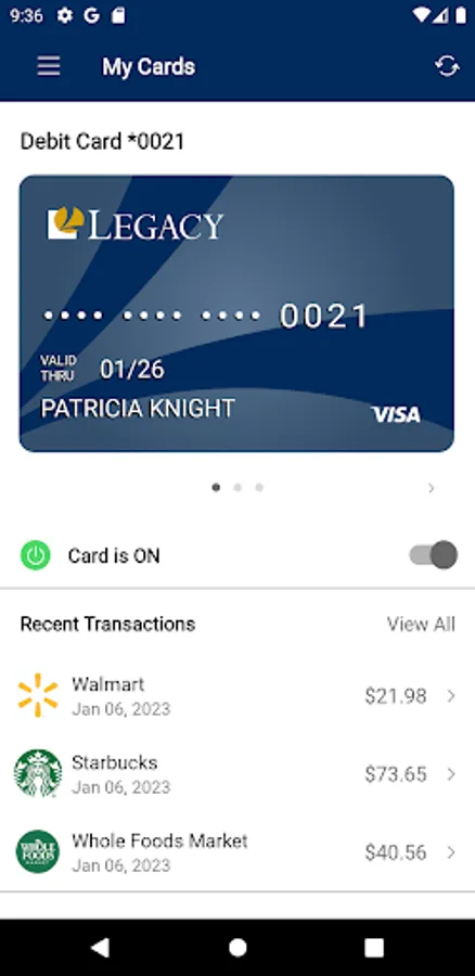 Legacy Card Control App gives you control of your Legacy Visa® debit cards.