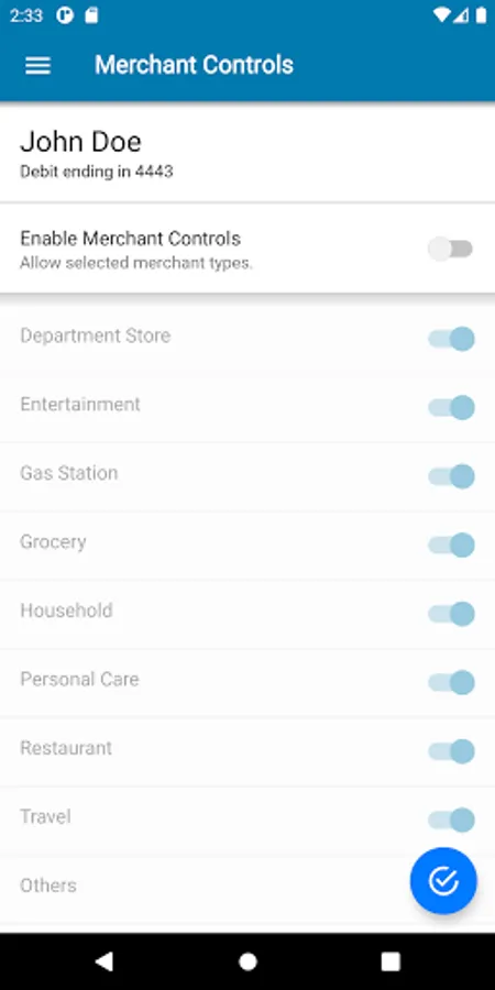 Spending limits can be established to allow transactions up to a certain dollar value and decline transactions when amounts exceed your defined thresholds. Transaction can be monitored and managed for specific merchant categories such as gas stations, department stores, restaurants, entertainment, travel and groceries. And your transaction can also be monitored for specific transaction types in store purchases, e-commerce transactions, mail/phone orders and ATM transactions.