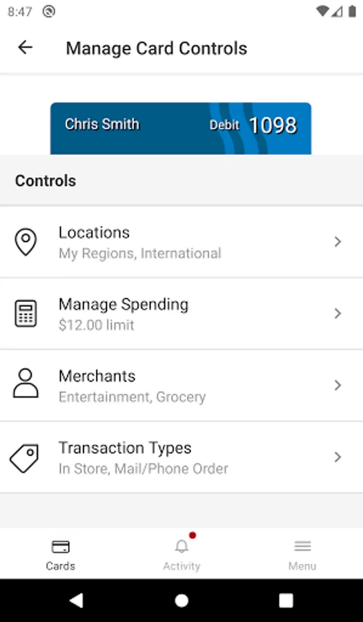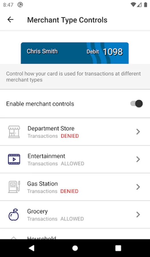 Spending limits can be established to allow transactions up to a certain dollar value and decline transactions when amounts exceed your defined thresholds. Transaction can be monitored and managed for specific merchant categories such as gas stations, department stores, restaurants, entertainment, travel and groceries. And you transaction can also be monitored for specific transaction types in store purchases, e-commerce transactions, mail/phone orders and ATM transactions