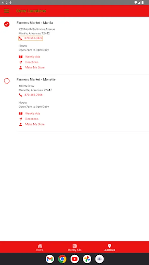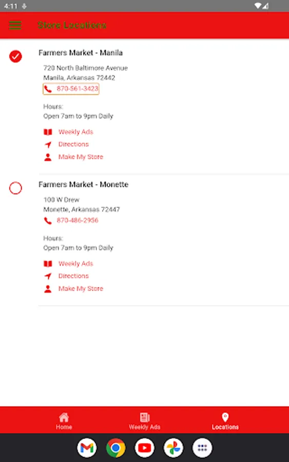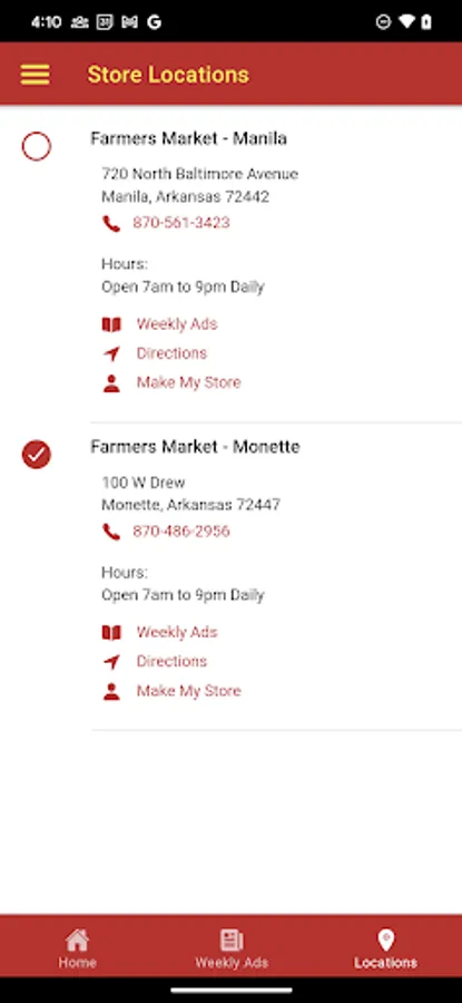 Farmers Markets, located in Manila and Monette Arkansas are your local grocery stores.