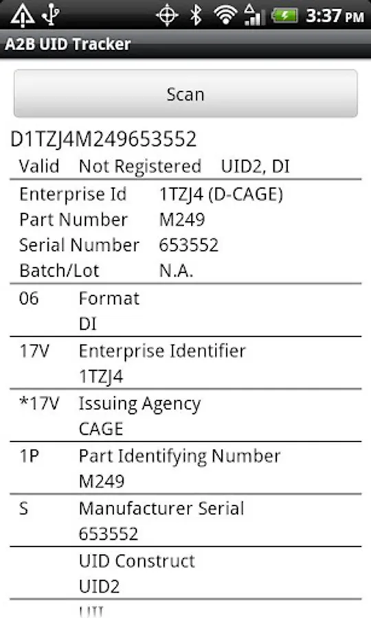 Use your device’s camera to read a military IUID code and validate the mark against MIL-STD-130N. Performs a syntax check in accordance with ISO standards. Displays the human-readable UII containing pedigree data. Also performs an IUID Registration check with the DoD IUID Registry. Scans all types of IUID materials and sizes. Please note that the clarity of the IUID mark, materials and marking methods used, and ambient lighting will affect the performance and quality of results.