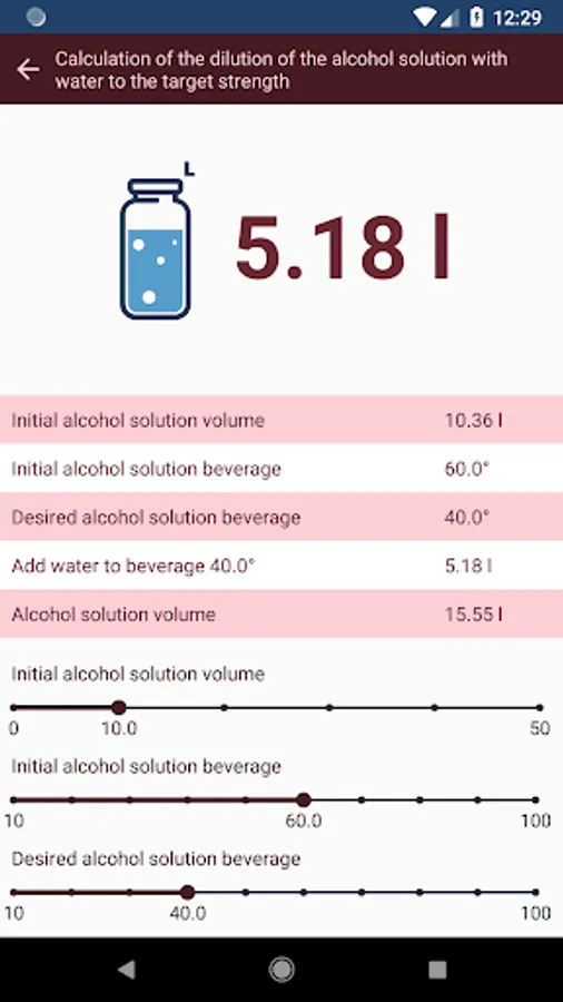 5. Calculation of dilution of the alcohol solution with water to the target strength, taking into account contracting.