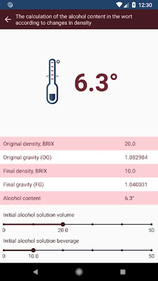 6. The calculation of the alcohol content in the wort according to the results of changes in density with a refractometer.