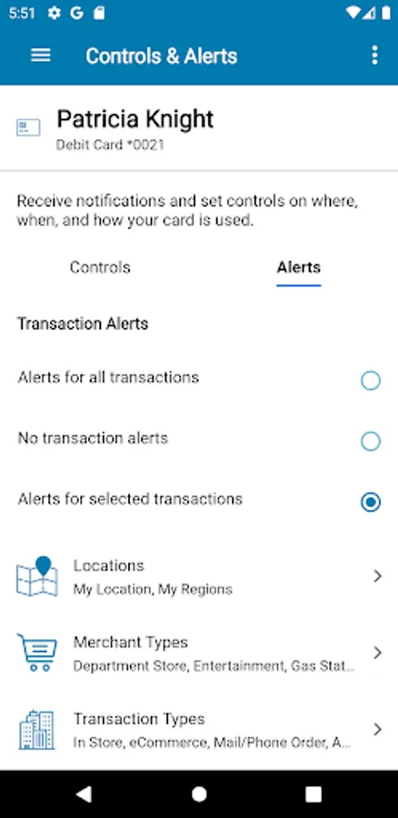Set spending limits to decline transactions above your thresholds. Monitor activity by category such as gas stations and restaurants, and by type: in-store purchases, e-commerce transactions and ATM transactions.