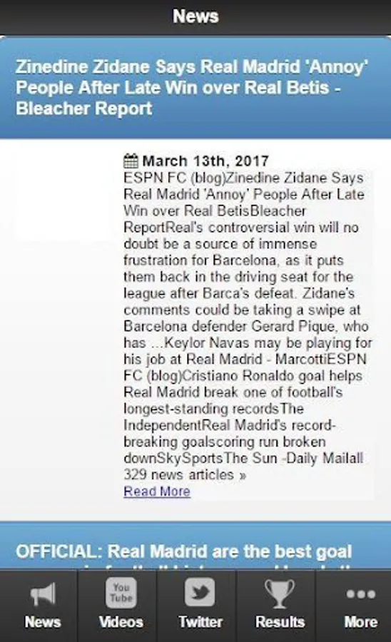 This unofficial fan app gives you access to videos and social media about Real soccer. Find out about the latest football transfer news and latest stories about the and its current players such as Cristiano Ronaldo and Gareth Bale.