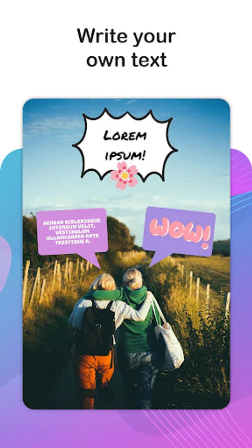 Edit your photo the way you like with over 200 design options, from colorful speech balloons to comic-like bubbles. You can personalize the text the way you want with multiple fonts, letter options and colors. Add fun stickers to have your personal touch in the edited photo.