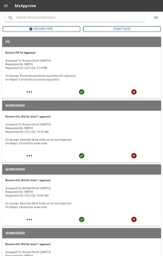 MxApprove allows users to access their inbox, review the records that are assigned to them, and accept, reject, and reassign assignments. All on the go, and all using the authorized IBM Maximo API's.