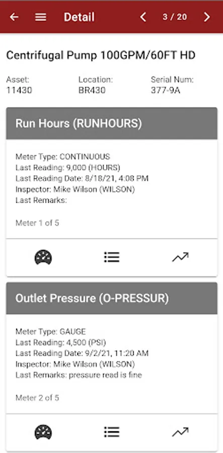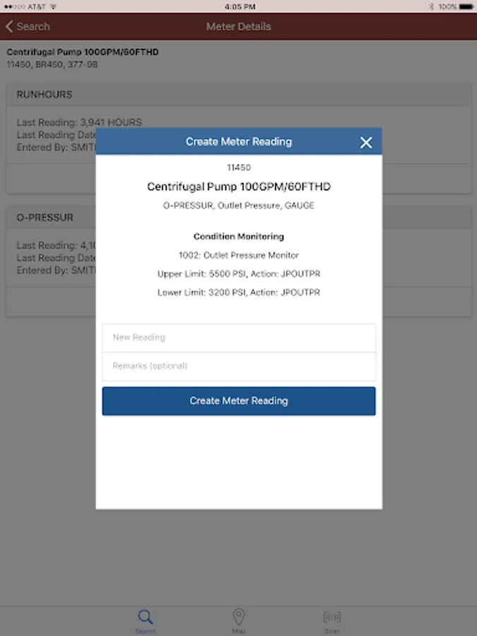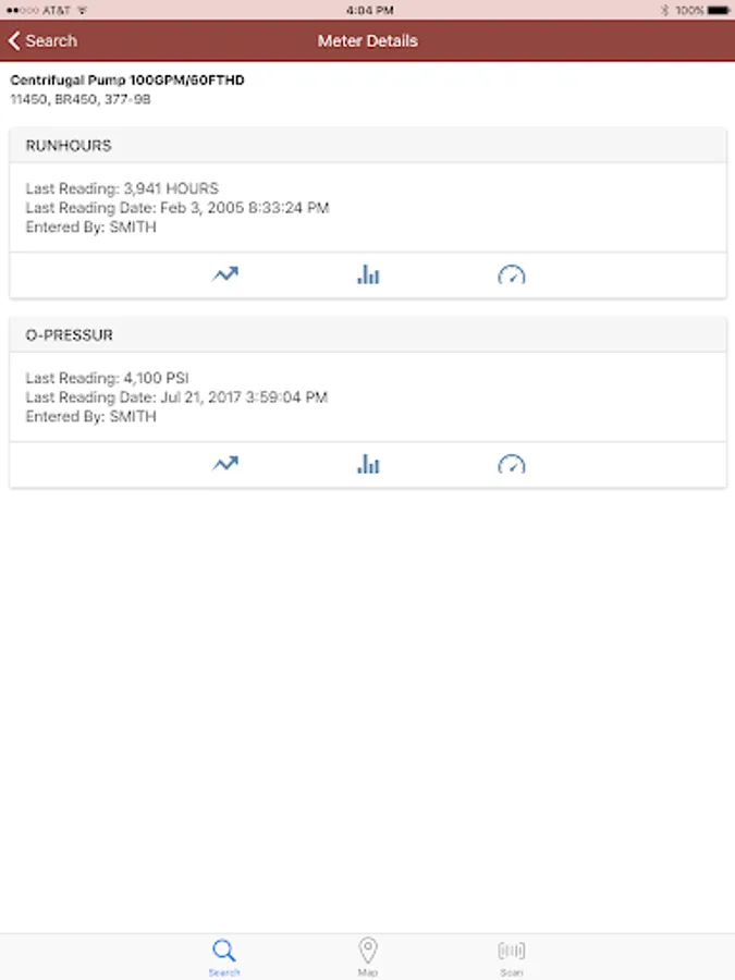 That's where MxMeter comes in. Rather than capturing information on paper and either filing the information away, or transcribing the information into the system on a desktop computer, MxMeter allows users to capture meter readings right at the source. Users can also view past readings and see them displayed in trend charts all while standing in front of the equipment. MxMeter makes finding the equipment easy as well, with barcode scanning capability, integrated Google maps, and enhanced search features.