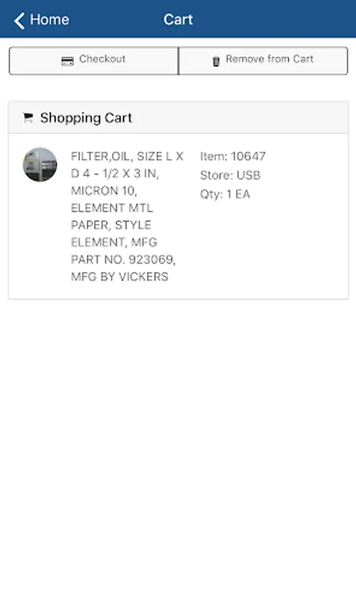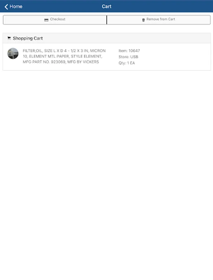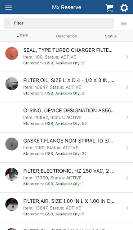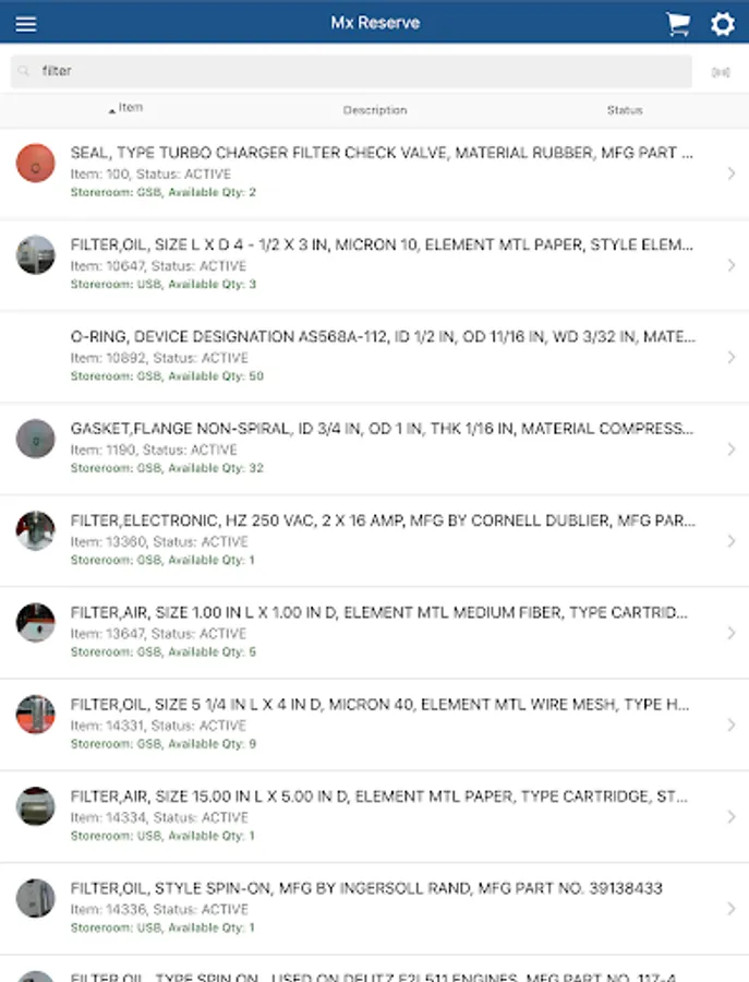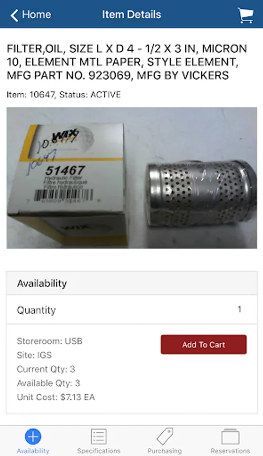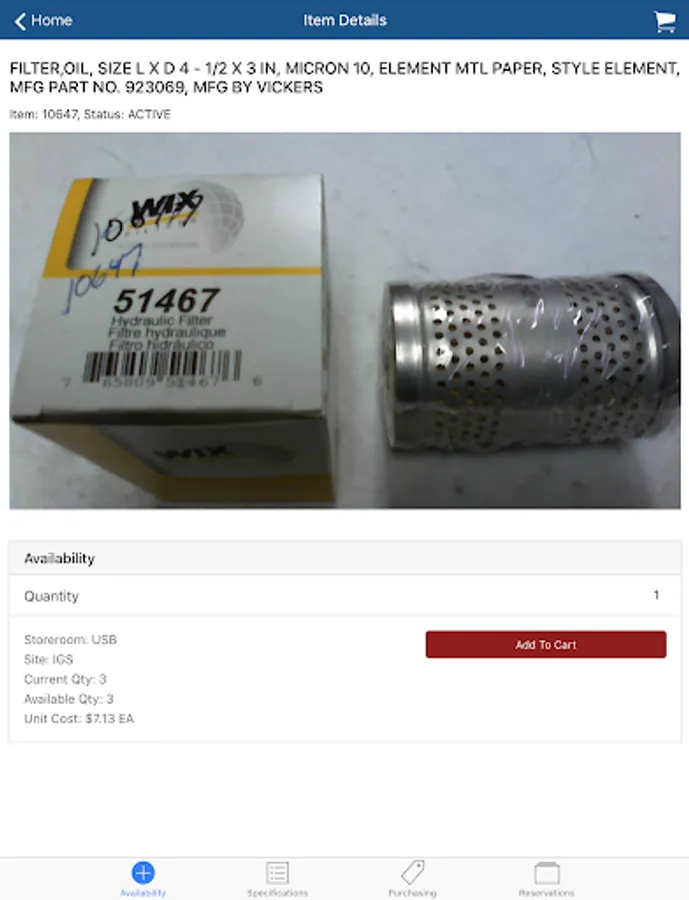 That’s where MxReserve comes in. Users can access the organization's full item catalog and perform intelligent searches, including bar code or QR code scanning, to find the part they need. They can see availability information, cost, outstanding purchasing and reservation information, as well as an image of the item. From there, they can add items to their shopping cart and checkout to create Material Requisitions. They can also see their past orders, and reorder items based upon that history.