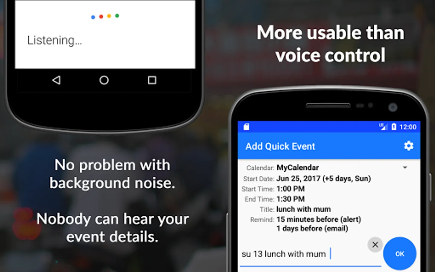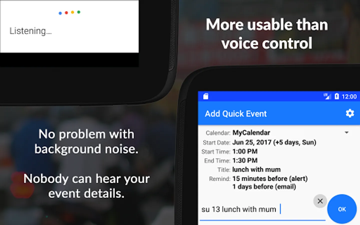 This app is more usable than voice control. No problem with background noise. Nobody can hear your meeting details. Scheduling is safe and reliable.