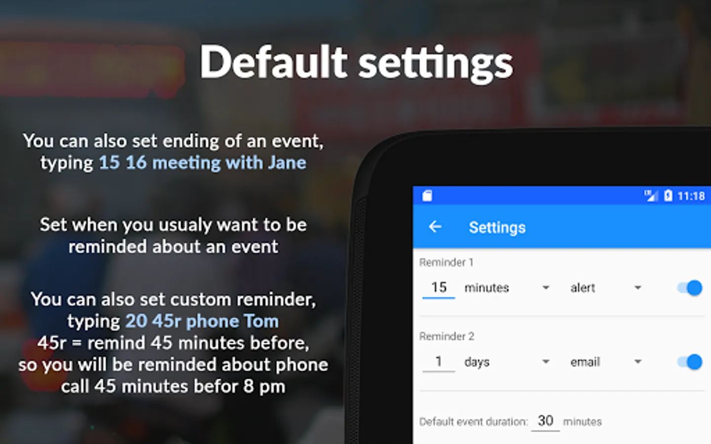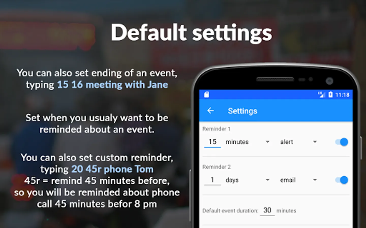 - You can also set custom reminder by typing: ‘20 45r phone Rich’. ‘45r’ = remind 45 minutes before, so you will be reminded about that phone call 45 minutes before 20:00.