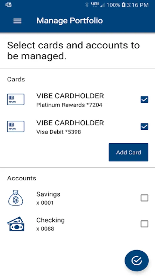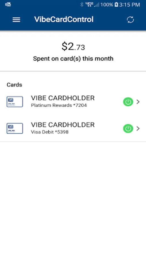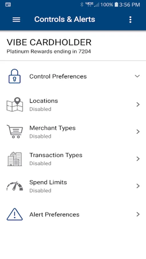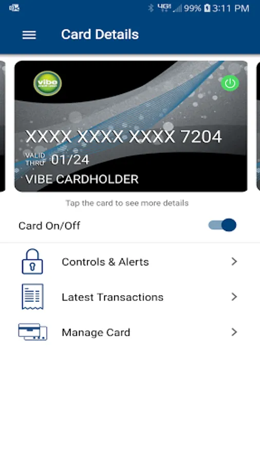 • Manage how, when and where your cards are used—on your own terms. Vibe Card Controls enables you to set controls regarding the transaction types, geographic rules, and the merchant types where your card can be used.