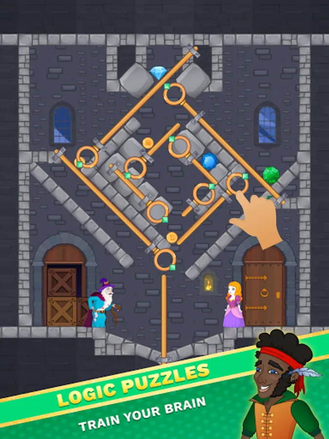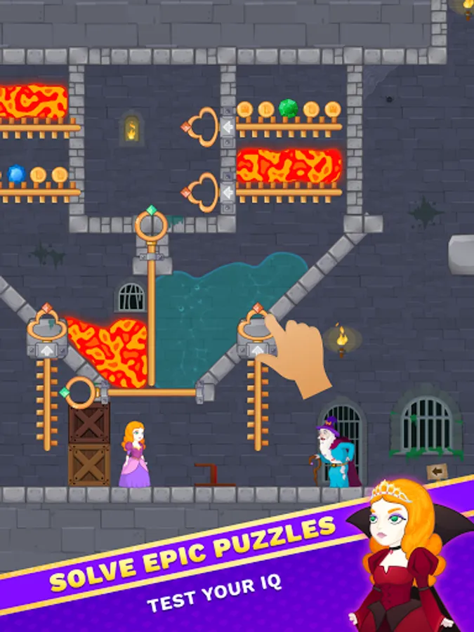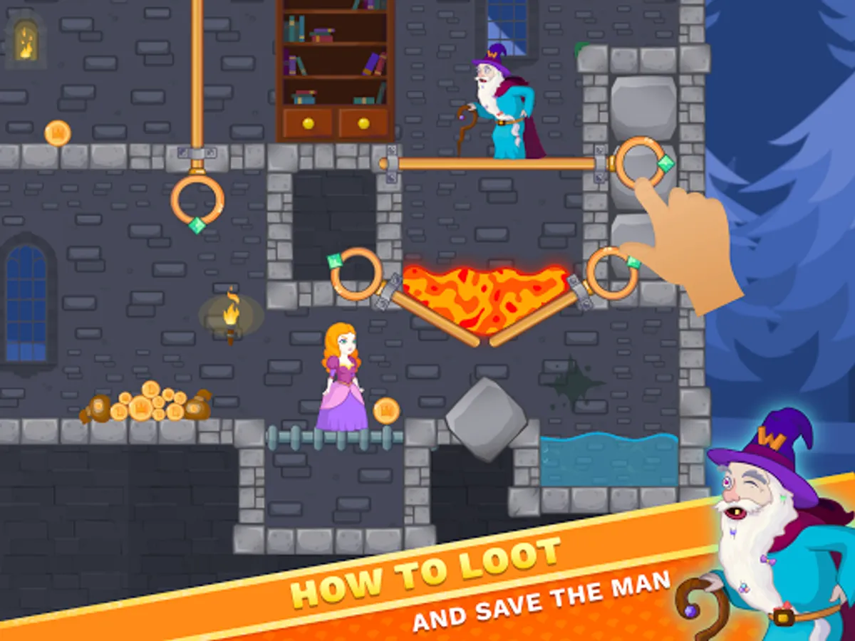 Logic puzzles are finally implemented in the most ingenious way in this pin rescue game. If you find other pull the pin games where hero rescue princess or you have to pull him out game not hard enough for your sharp brain - try our “How To Loot” logic puzzles. Exercise your brain, solve tricky pull pin puzzles, pull the pin, rescue princess, loot shiny treasure, defeat the goblin on a variety of handcrafted levels in a fantasy setting. Funny characters and original story-line will make your experience even better in one of the best problem solving games. Be the hero rescue princess!