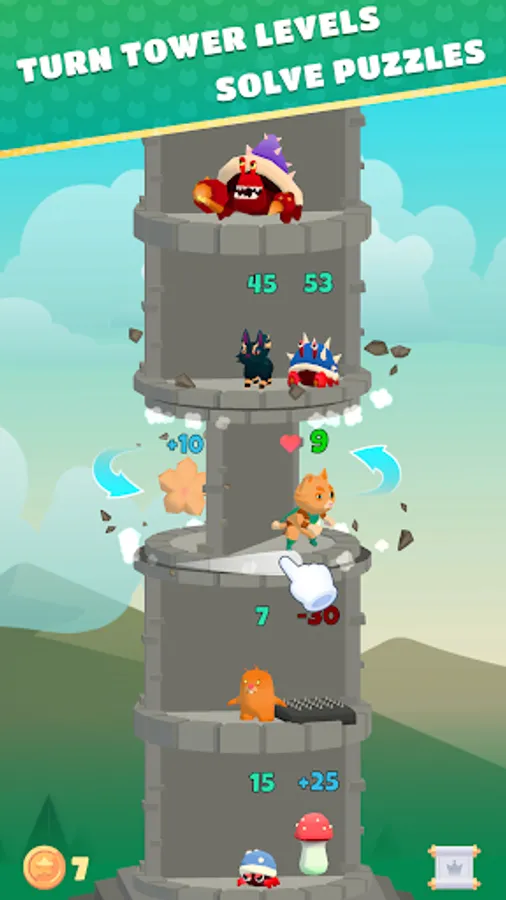 Challenges you won't find in other adventure games! Put your logical thinking to the test by resolving merge puzzles that combine numbers and math operations. Strategically plan your moves to maximize your hero's strength growth and overcome obstacles. Every turn brings you closer in your purr-suit to become the legend of math games!