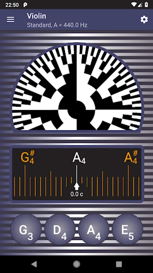 The chromatic tuner accurately detects the frequency of the tone played on your instrument, and shows it on the chromatic scale. The target strings are highlighted on the scale, and you can see how far is the tone from being in tune. When you get close enough, you can use the strobe tuner for fine tuning.