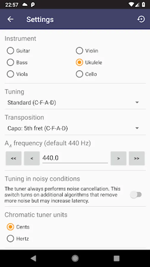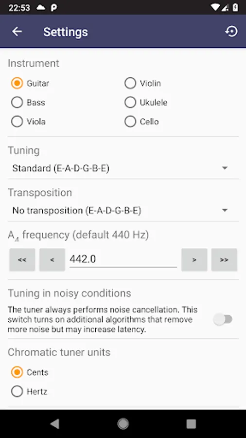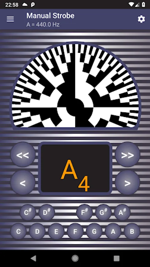 You can also play the reference tones using the buttons at the bottom of the screen. The tone is synthesized, and respects the setting of the concert pitch.