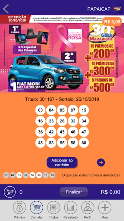 1. Choice of Certificates: Screen where the user can view the available tens combinations and add to the shopping cart.