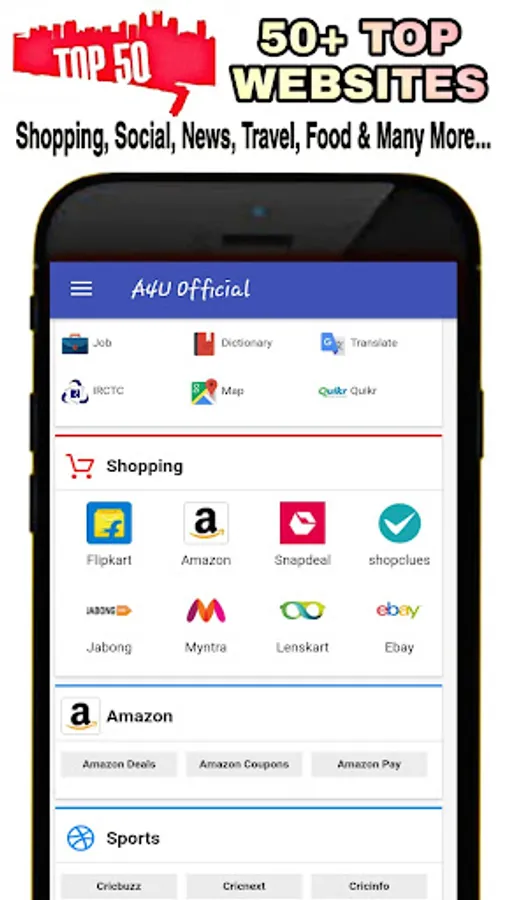 • 50+ Top Sites includes shopping,social,news,travel,food and many more.