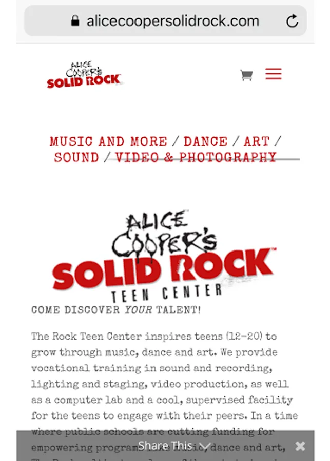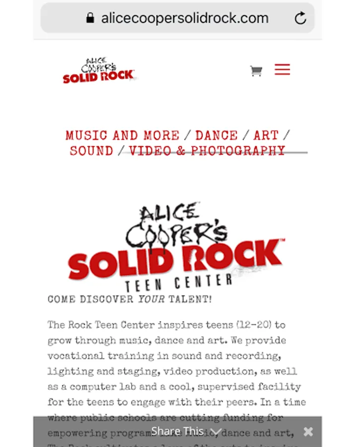 Solid Rock, a faith-based 501 (c) (3) nonprofit organization, was founded by Sheryl and Alice Cooper and longtime friend Chuck Savale in 1995. Solid Rock’s mission is to make an everlasting difference in the lives of teenagers. The Rock Teen Center opened in 2012 as part of that mission. “We are fulfilling a vision we’ve had for several years…to provide teens with a central place to learn, have fun, and explore their creativity in a supportive and safe environment.” Alice Cooper. Thank you for partnering with Sheryl and Alice Cooper to make a difference in our community!