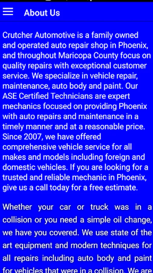 Crutcher Automotive is a family owned and operated auto repair shop in Phoenix, and throughout Maricopa County focus on quality repairs with exceptional customer service. We specialize in vehicle repair, maintenance, auto body and paint. Our ASE Certified Technicians are expert mechanics focused on providing Phoenix with auto repairs and maintenance in a timely manner and at a reasonable price. Since 2007, we have offered comprehensive vehicle service for all makes and models including foreign and domestic vehicles. If you are looking for a trusted and reliable mechanic in Phoenix, give us a call today for a free estimate.