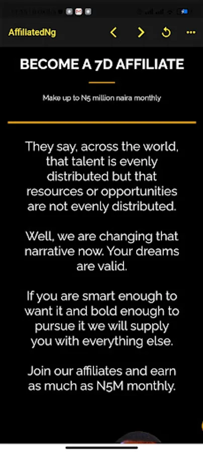 AffiliatedNg provides first, a robust platform for people to practise-earn with the skills and Secondly, a marketplace (7DC.) where the affiliates can sell. Hence, Membership of AffiliatedNg in itself is a Product. In addition: On 7DC (the ecommerce platform), affiliates sell products and services ranging from Digital Courses [Copywriting, Closing, Sales Automation etc] to Physical Products [Clothes, Shoes, Gifts etc] to Services [Telemedicine, Insurance, Spa etc].