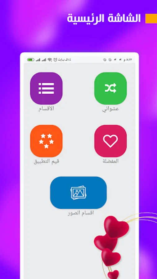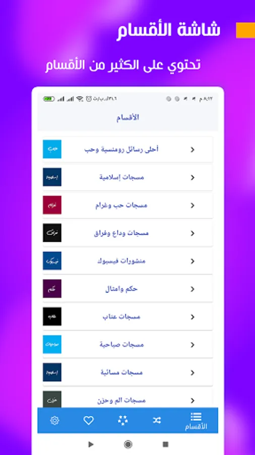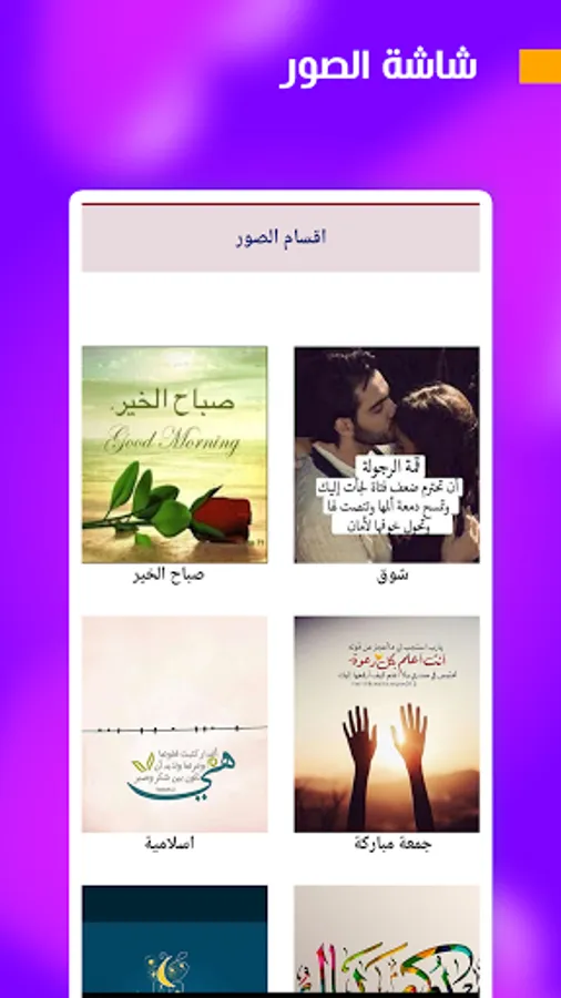 The application contains two main sections, a section for image cases and a section for written cases, romantic love letters. As each section, in turn, contains many sub-sections such as judgment, grief jokes, friendship ... etc.