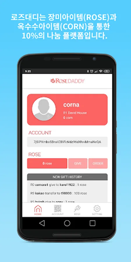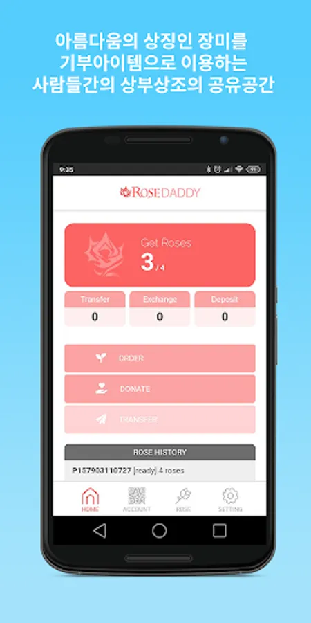 Rose Daddy is a platform that donates the rose and is a community for mutual help as donating rose and using CORN(symbol of foodstuff) makes you enjoy pleasure with reasonable consuming culture.