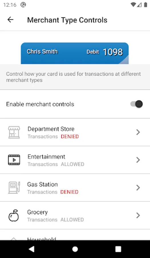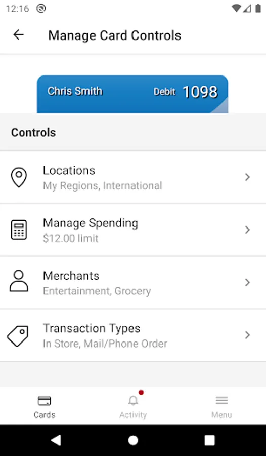 Spending limits can be established to allow transactions up to a certain dollar value and decline transactions when amounts exceed your defined thresholds. Transaction can be monitored and managed for specific merchant categories such as gas stations, department stores, restaurants, entertainment, travel and groceries. And your transactions can also be monitored for specific transaction types in store purchases, e-commerce transactions, mail/phone orders and ATM transactions