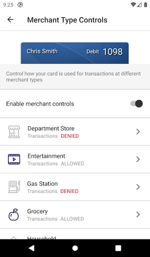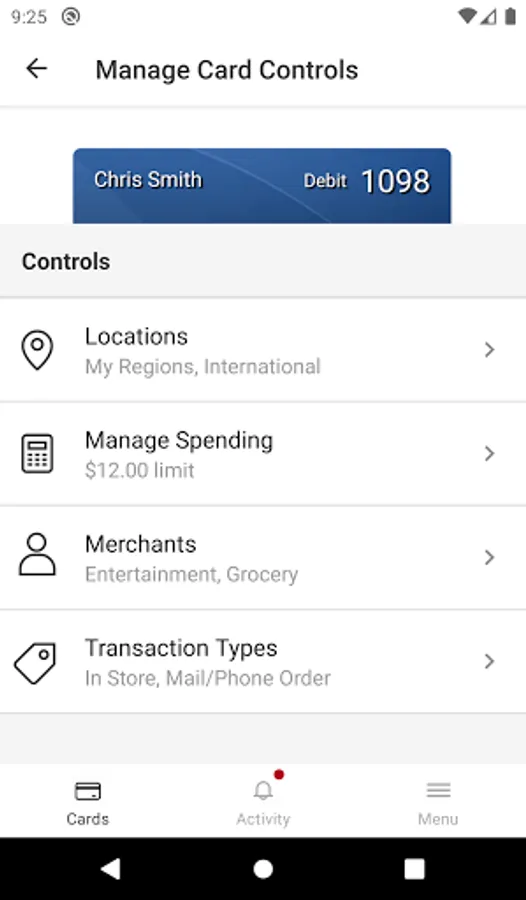 Spending limits can be established to allow transactions up to a certain dollar value and decline transactions when amounts exceed your defined thresholds. Transaction can be monitored and managed for specific merchant categories such as gas stations, department stores, restaurants, entertainment, travel and groceries. And you transaction can also be monitored for specific transaction types in store purchases, e-commerce transactions, mail/phone orders and ATM transactions