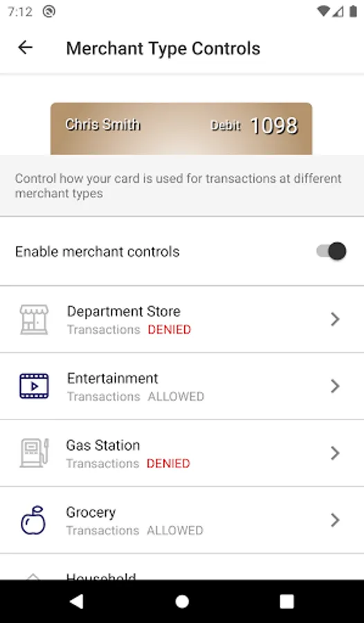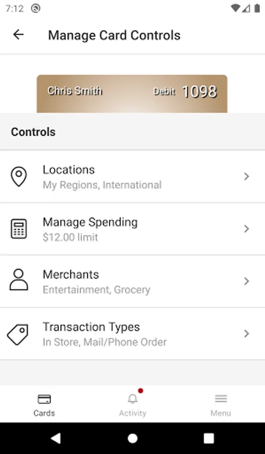 Spending limits can be established to allow transactions up to a certain dollar value and decline transactions when amounts exceed your defined thresholds. Transaction can be monitored and managed for specific merchant categories such as gas stations, department stores, restaurants, entertainment, travel, and groceries. And your transaction can also be monitored for specific transaction types in store purchases, e-commerce transactions, mail/phone orders, and ATM transactions