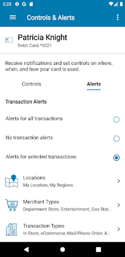The My Location control can restrict transactions to merchants located within a certain range of your locations (using your phone’s GPS); transactions requested outside the specific range can be declined. The My Region control uses city, state country or zip code on an expandable interactive map, transactions requested by the merchants outside of a specific region can be declined.