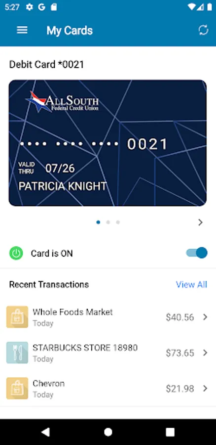 When the card is “on,” transactions are allowed in accordance with your usage settings. When the card is “off,” no purchase or withdrawals are approved until the card is subsequently turned back to “on”. This control can be used to disable a lost or stolen card, prevent fraudulent activity, or control spending.