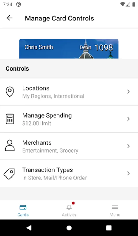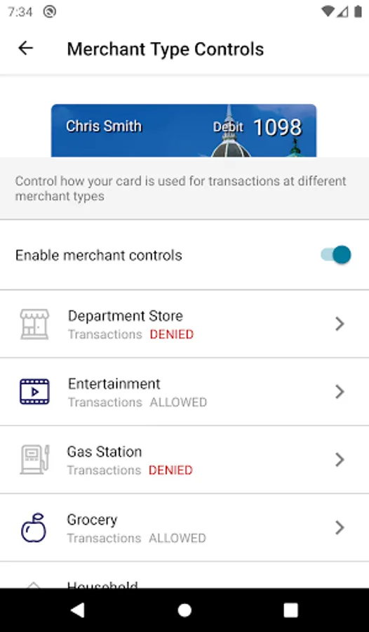 Spending limits can be established to allow transactions up to a certain dollar value and decline transactions when amounts exceed your defined thresholds. Transaction can be monitored and managed for specific merchant categories such as gas stations, department stores, restaurants, entertainment, travel and groceries. And you transaction can also be monitored for specific transaction types in store purchases, e-commerce transactions, mail/phone orders and ATM transactions